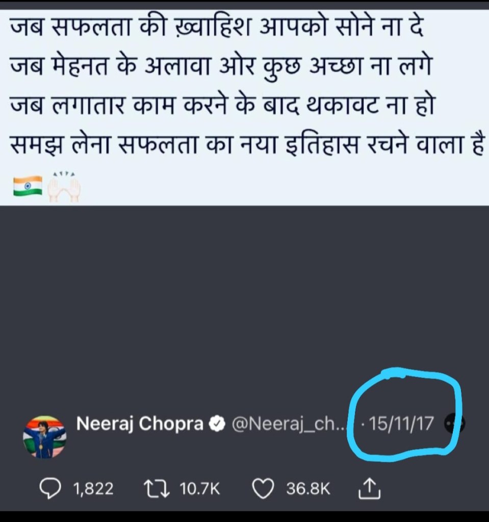 Just to quote a recent incident of us…INDIA… winning an Olympic gold. My fellow Indians, it was more than hard work and destiny. It was what the nation’s pride “Neeraj Chopra” thought strongly and expressed four years back. Take a look at his 4 year old tweet.